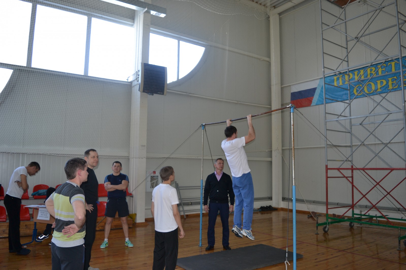 В подтягивании на высокой перекладине лучшие результаты у Брызгалова Николая с Управления сельского хозяйства, Сидорова Ивана с городской больницы, Потапова Павла с Управления образования и Стрепкова Александра из газеты «Сорочинский вестник», у женщин на низкой перекладине - у Сундеевой Екатерины с Пенсионного фонда и Кенжигалиевой Юлии с отдела по культуре и искусству.