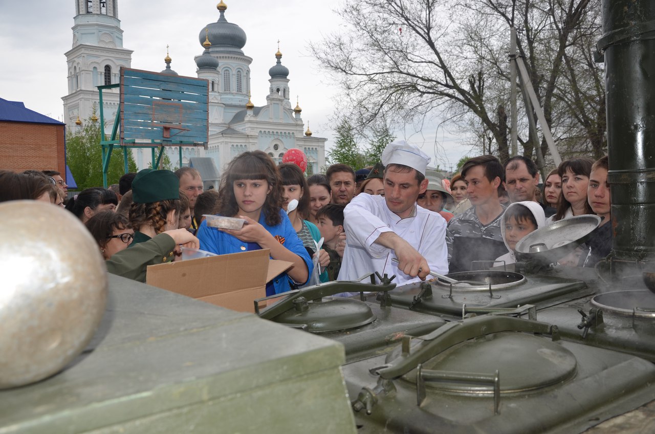Добрая традиция в день празднования Дня Великой Победы проводить реконструкцию полевой солдатской кухни для всех желающих была поддержана и в день 72-ой годовщины Победы в Великой Отечественной войне. И эта традиция состоялась благодаря отзывчивости предпринимателей Сорочинского городского округа и профессиональному мастерству поваров филиала ГАОУ СПО «Аграрный техникум» города Сорочинска.