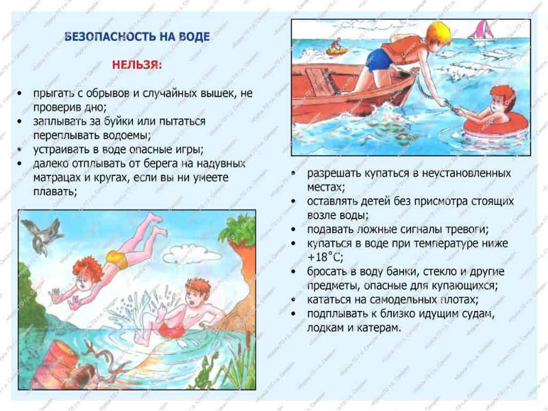 6. Вызвать "Скорую помощь". Если человек уже погрузился в воду, не оставляйте попыток найти его на глубине, а затем вернуть к жизни. Это можно сделать, если утонувший находился в воде не более 6 минут. НЕЛЬЗЯ ОСТАВЛЯТЬ ПОСТРАДАВШЕГО БЕЗ ВНИМАНИЯ (в любой момент может произойти остановка сердца) САМОСТОЯТЕЛЬНО ПЕРЕВОЗИТЬ ПОСТРАДАВШЕГО, ЕСЛИ ЕСТЬ ВОЗМОЖНОСТЬ ВЫЗВАТЬ СПАСАТЕЛЬНУЮ СЛУЖБУ. Помните! Только неукоснительное соблюдение мер безопасного поведения на воде может предупредить беду. ПАМЯТКА ОСНОВНЫЕ ПРАВИЛА БЕЗОПАСНОГО ПОВЕДЕНИЯ НА ВОДЕ. Водоемы являются опасными в любое время года. Летом они опасны при купании и пользовании плавсредствами. Опасность чаще всего представляют сильное течение (в том числе подводное), глубокие омуты и подводные холодные ключи. Летом на водоемах следует соблюдать определенные правила безопасного поведения. Во-первых, следует избегать купания в незнакомых местах, специально не оборудованных для этой цели. Во-вторых, при купании запрещается: