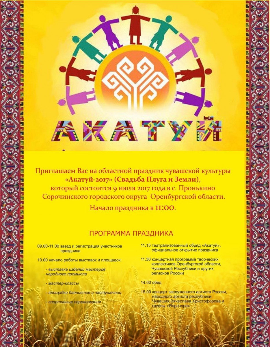 Уважаемые жители Сорочинского городского округа! Приглашаем Вас на областной праздник чувашской культуры "Акатуй - 2017", который состоится 9 июля в селе Пронькино Сорочинского городского округа!
