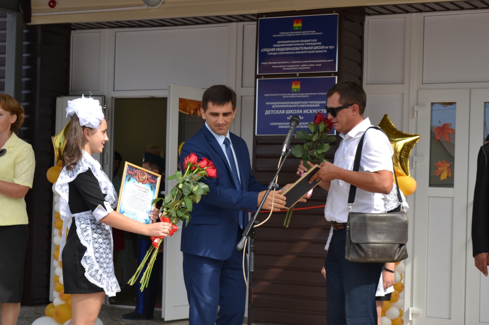 В торжественной обстановке Алексей Александрович наградил Благодарственным письмом Главы Сорочинского городского округа за личное участие и помощь школе председателя Совета депутатов города Сорочинска Владимира Лардугина, депутата Совета депутатов города Сорочинска Виктора Отпущенникова, главного инженера общества с ограниченной ответственностью «Альтаир - С» Сергея Боронина, директора ООО «Мясокомбинат «Сорочинский» Ольгу Аравицкую.