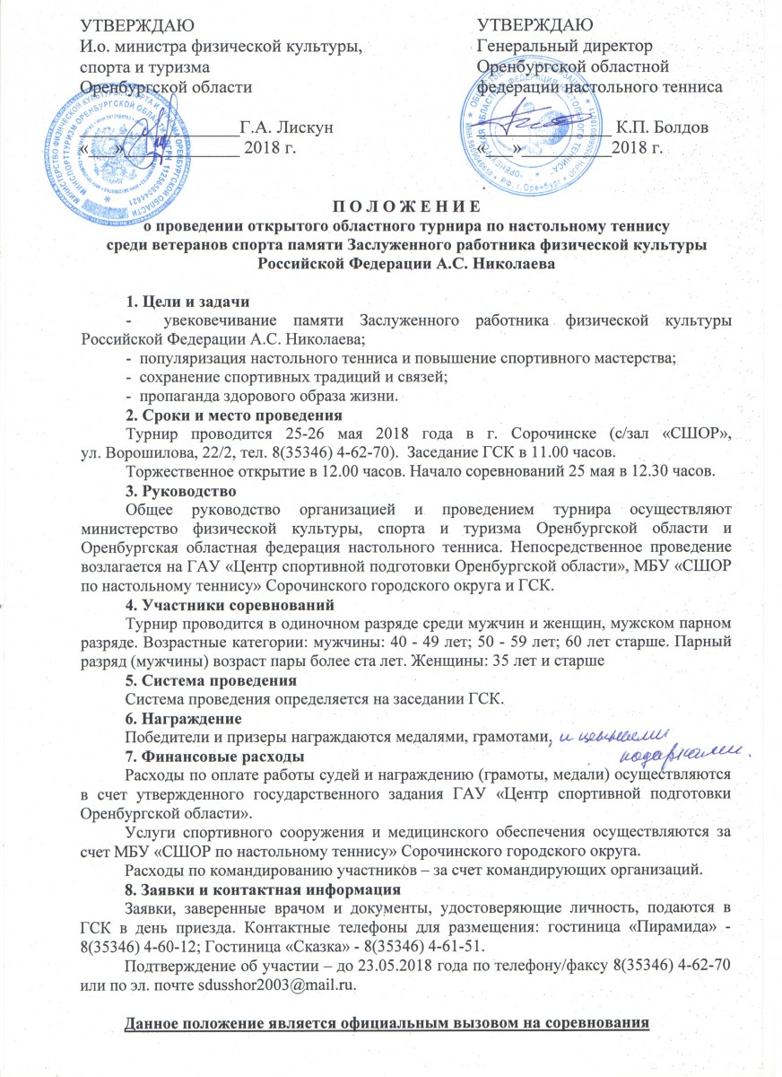 В целях увековечивания памяти заслуженного работника физической культуры Российской Федерации Николаева А.С. в Сорочинском городском округе 25-26 мая 2018 г. пройдет открытый областной турнир по настольному теннису среди ветеранов спорта.